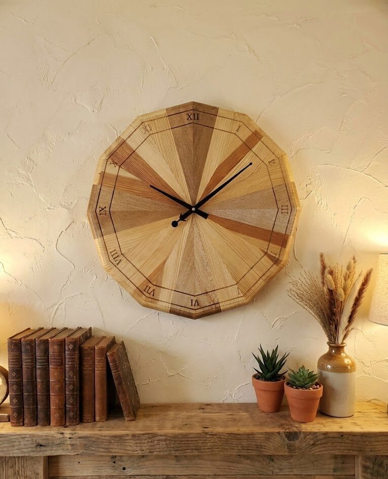 This elegant dodecagonal clock features a unique twelve-sided design crafted entirely from premium wood. Each clock showcases the natural beauty of the wood’s grain. With silent quartz movement and easy installation, this clock blends modern design with timeless craftsmanship, making it a perfect addition to any contemporary home or office decor. Complete with quartz movement silent clock motor and metal hands (battery not included).